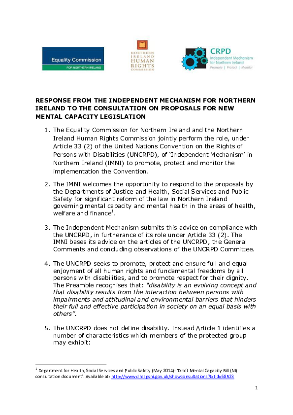The IMNI welcomes the opportunity to respond to the proposals by the Departments of Justice and Health, Social Services and Public Safety for significant reform of the law in Northern Ireland governing mental capacity and mental health in the areas of health, welfare and finance .