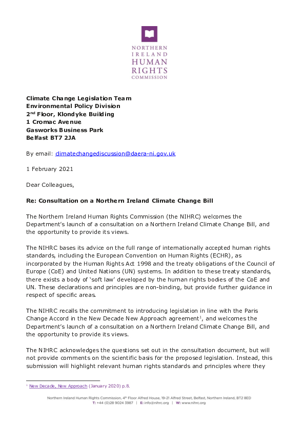 The NIHRC recommends that a Northern Ireland Climate Change Bill is fully compliant with international human rights obligations.