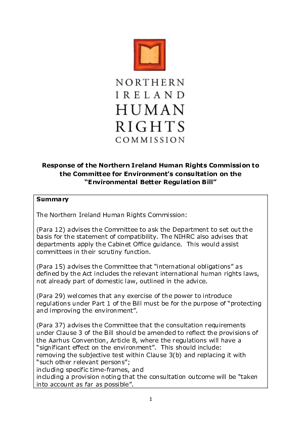 Response of the Northern Ireland Human Rights Commission to the Committee for Environment’s consultation on the “Environmental Better Regulation Bill”.