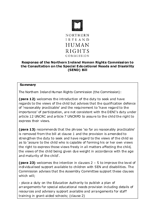 The Northern Ireland Commission pursuant to Section 69 (1) of the Northern Ireland Act 1998, reviews the adequacy and effectiveness of law and practice relating to the protection of Human Rights. In accordance with this function the following statutory advice is submitted in response to the Committee for Education’s consultation on the proposed Special Educational Needs and Disability Bill.