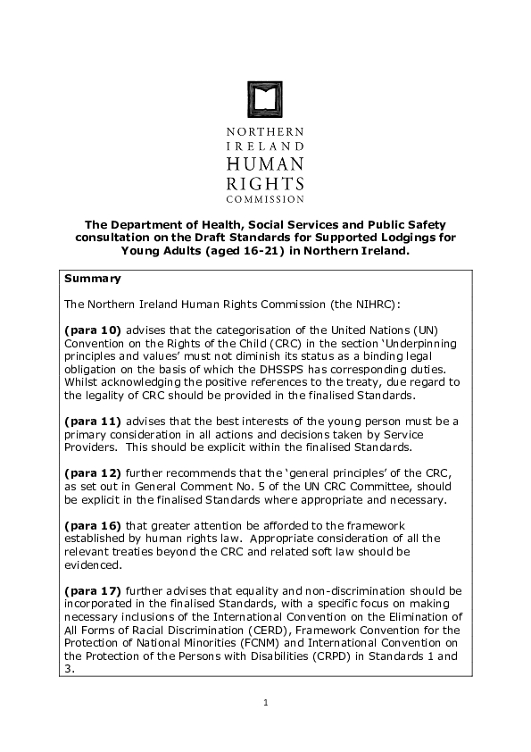 Response to the DHSSPS Consultation on “Draft Standards for Supported Lodgings for Young Adults (aged 16-21) in Northern Ireland”