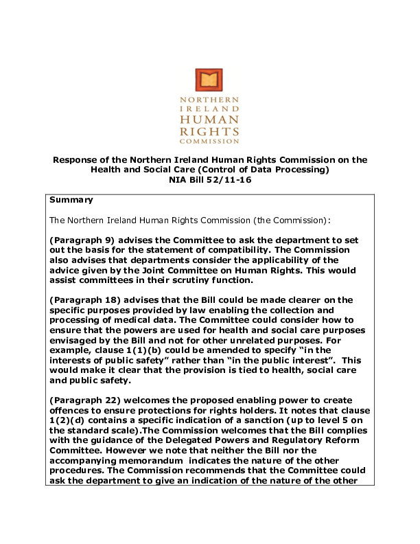Response of the Northern Ireland Human Rights Commission on the Health and Social Care (Control of Data Processing) Bill.