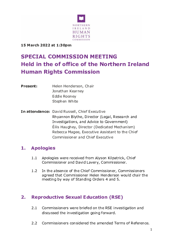 The Northern Ireland Human Rights Commission held a Special Commission Meeting on 15 March 2022.