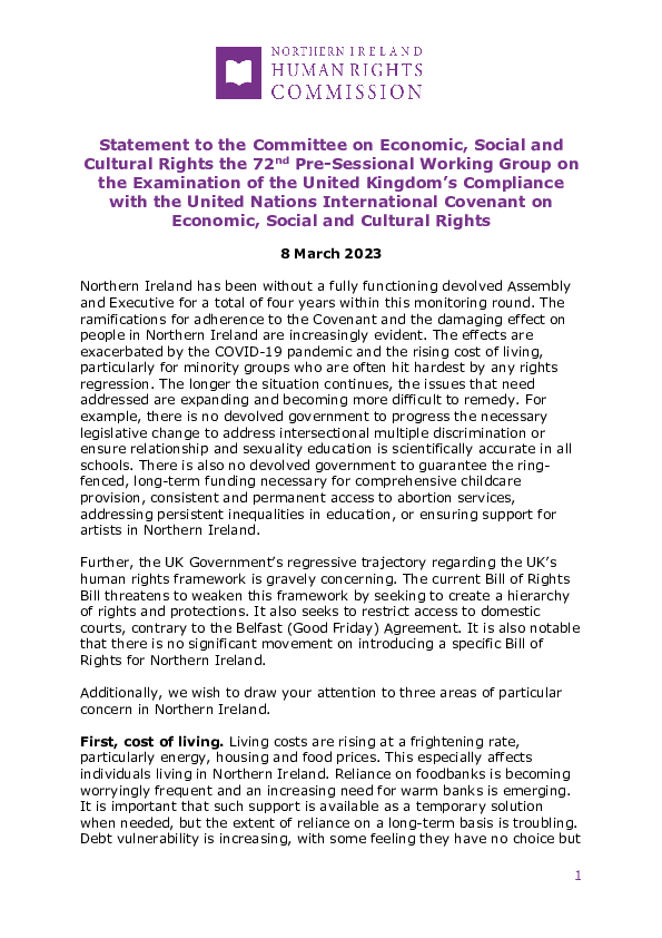 Statement to the Committee on Economic, Social and Cultural Rights the 72nd Pre-Sessional Working Group on the Examination of the United Kingdom’s Compliance with the United Nations International Covenant on Economic, Social and Cultural Rights