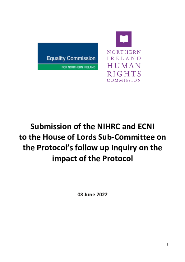 Submission of the NIHRC and ECNI to the House of Lords Sub-Committee on the Protocol’s follow up Inquiry on the impact of the Protocol