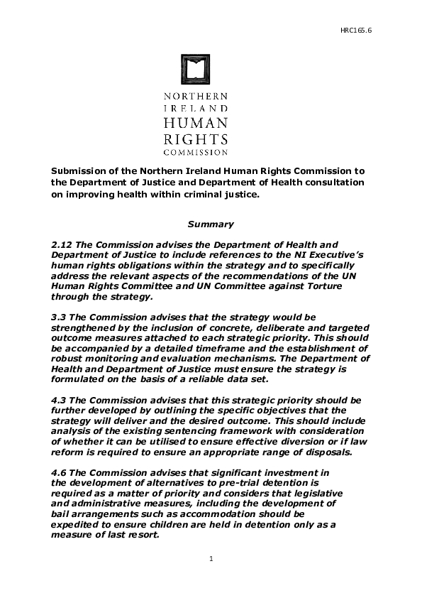 Submission of the Northern Ireland Human Rights Commission to the Department of Justice and Department of Health consultation on improving health within criminal justice