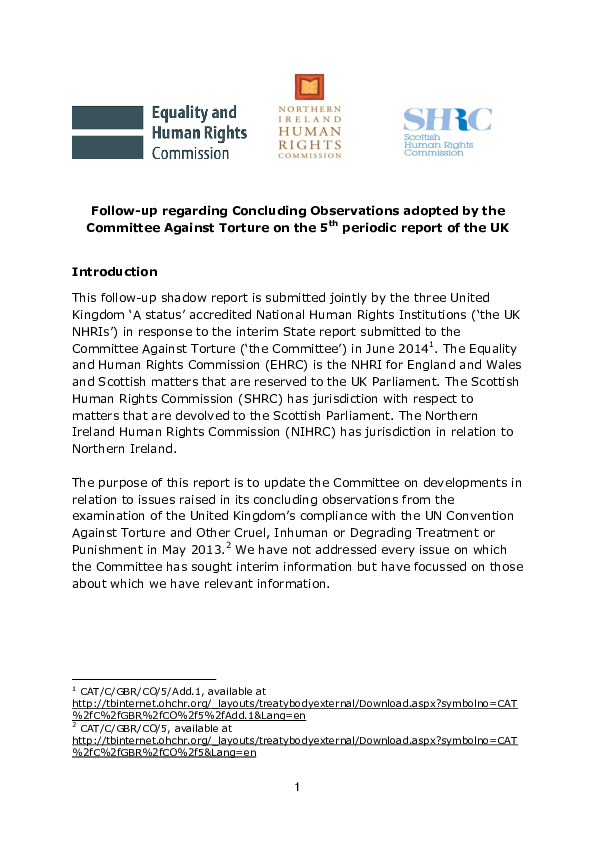 This follow-up shadow report is submitted jointly by the three United Kingdom ‘A status’ accredited National Human Rights Institutions (‘the UK NHRIs’) in response to the interim State report submitted to the Committee Against Torture (‘the Committee’) in June 2014. The Equality and Human Rights Commission (EHRC) is the NHRI for England and Wales and Scottish matters that are reserved to the UK Parliament. The Scottish Human Rights Commission (SHRC) has jurisdiction with respect to matters that are devolved to the Scottish Parliament. The Northern Ireland Human Rights Commission (NIHRC) has jurisdiction in relation to Northern Ireland.
