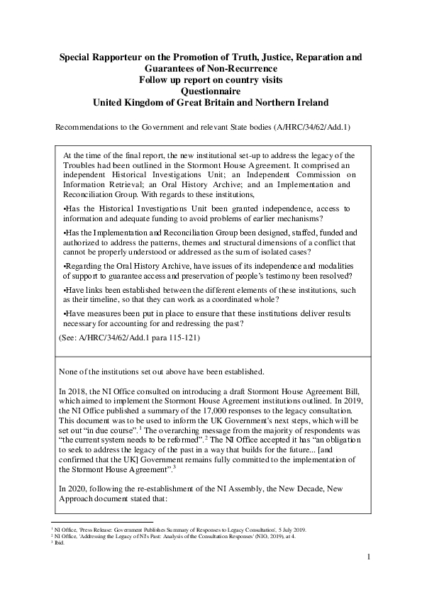 Submission: Special Rapporteur on the Promotion of Truth, Justice, Reparation and Guarantees of Non-Recurrence