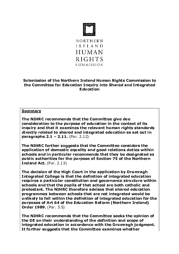 Submission of the Northern Ireland Human Rights Commission to the Committee for Education Inquiry into Shared and Integrated Education