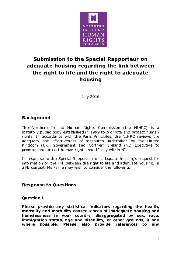 Submission to the Special Rapporteur on adequate housing regarding the link between the right to life and the right to adequate housing