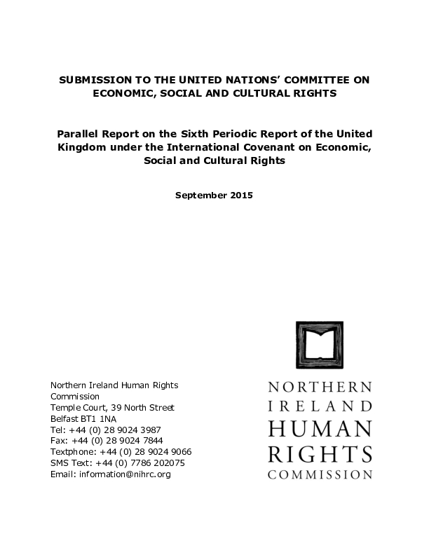 As part of the NIHRC’s engagement with the United Nations (UN) and Council of Europe treaty monitoring processes, it presents this submission regarding the UK’s Sixth Periodic Report on compliance with the United Nations International Covenant on Economic, Social and Cultural Rights (ICESCR) to the UN Committee on Economic, Social and Cultural Rights (the Committee) pre-session working group at its 56th Session.