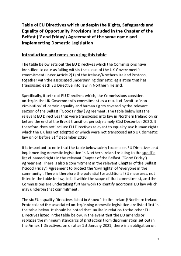 Table of EU Directives which underpin the Rights, Safeguards and Equality of Opportunity Provisions included in the Chapter of the Belfast (‘Good Friday’) Agreement of the same name and Implementing Domestic Legislation
