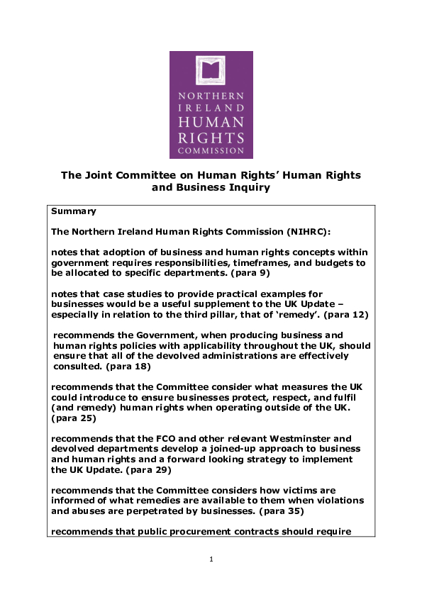 Northern Ireland Human Rights Commission (NIHRC) pursuant to section 69(1) of the Northern Ireland Act 1998, reviews the adequacy and effectiveness of law and practice relating to the protection of human rights. In accordance with this function the following statutory advice is submitted to the Joint Committee on Human Rights in response to a call for submissions relating to the Human Rights and Business Inquiry.