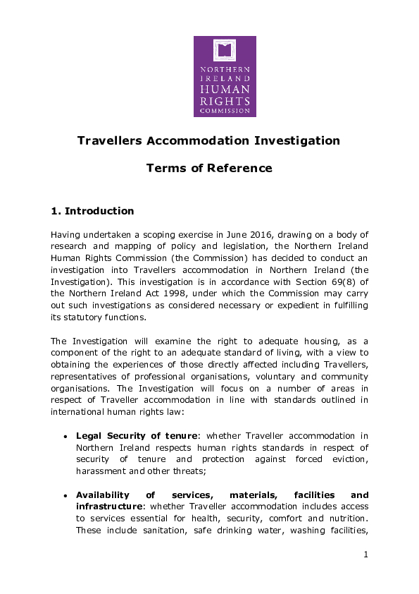 Having undertaken a scoping exercise in June 2016, drawing on a body of research and mapping of policy and legislation, the Northern Ireland Human Rights Commission (the Commission) has decided to conduct an investigation into Travellers accommodation in Northern Ireland (the Investigation). This investigation is in accordance with Section 69(8) of the Northern Ireland Act 1998, under which the Commission may carry out such investigations as considered necessary or expedient in fulfilling its statutory functions.