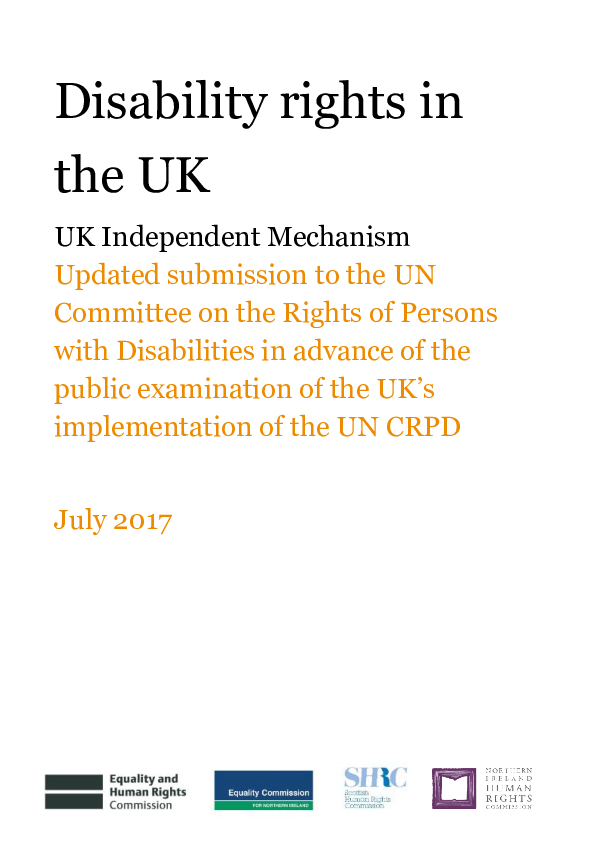 This submission has been produced by the United Kingdom Independent Mechanism (UKIM) in advance of the public examination of the UK’s implementation of the UN CRPD. In 2009 the UK Government designated the Equality and Human Rights Commission (EHRC), the Equality Commission for Northern Ireland (ECNI), the Northern Ireland Human Rights Commission (NIHRC) and the Scottish Human Rights Commission (SHRC) as the UK’s Independent Mechanism under CRPD Article 33, tasked with promoting, protecting and monitoring implementation of the CRPD.