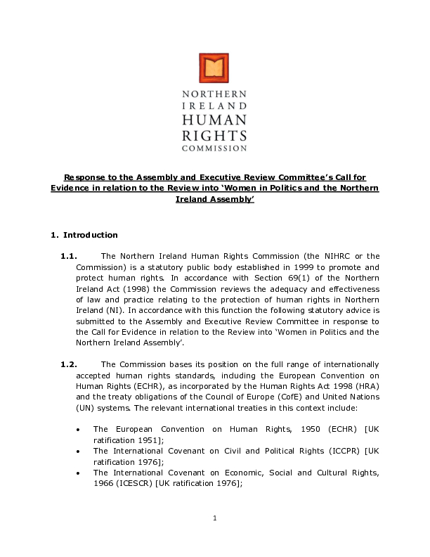 The Commission welcomes the commitment illustrated by this Review to analyse the barriers facing women in politics in NI and notes the potential for the Review and its recommendations to contribute to steps which would increase compliance with international human rights obligations.